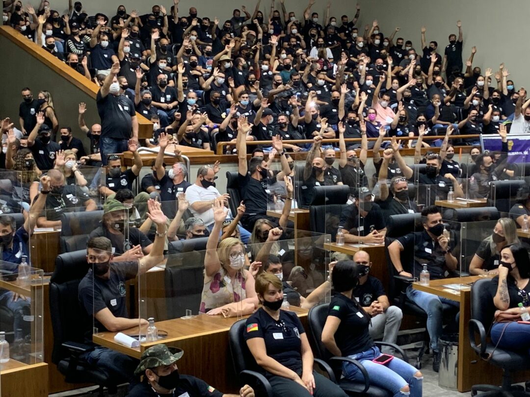 O Sindicato dos Servidores Penitenciários do Estado do Rio Grande do Sul (Amapergs) aprovou nesta terça-feira (11), em assembleia geral realizada na Câmara Municipal de Porto Alegre, o início do “estado de grave” da categoria. Durante a tarde, representantes do sindicato entregaram uma carta de exigências ao secretário estadual de Justiça, Cidadania e Direitos Humanos, Mauro Hauschild.