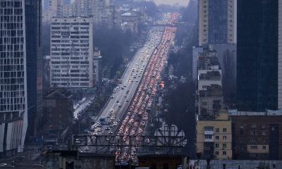 Fotos da capital ucraniana Kiev, na manhã desta quinta-feira (24), mostram longas filas de carro tentando sair da cidade após a Rússia lançar um ataque contra o...