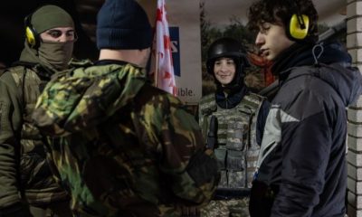 Voluntários paramilitares da Legião Nacional da Geórgia dão instruções a dois meninos sobre técnicas de tiro em Kiev, Ucrânia. A Legião Nacional da Geórgia viu um...