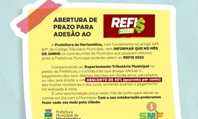 A Prefeitura de Horizontina, com fundamento no artigo 249, §4º, do Código Tributário Municipal, vem informar que no mês de junho, os contribuintes do Município que...