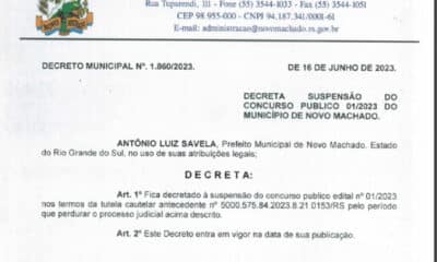 O Prefeito Municipal de Novo Machado, Antônio Luís Savella (PP) decretou no final da tarde desta sexta-feira, dia 16 de junho, a suspensão da aplicação das...