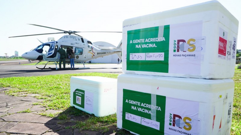 O helicóptero da BM transporta vacinas para Caxias do Sul, com a carga da 5ª CRS. O avião King Air, da BM, decola para fazer um roteiro de cinco cidades: Erechim (doses destinadas às 11ª e 6ª CRS); Palmeira das Missões (15ª e 2ª CRS); Santo Ângelo (9ª, 12ª, 14ª e 17ª CRS); Bagé (7ª CRS); e Pelotas (3ª CRS).