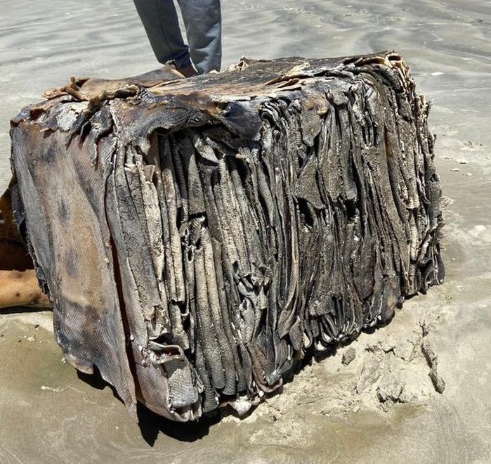 Aparentemente, o material localizado essa semana no Litoral Médio ficou exposto ao sol: está com as bordas escuras, como se tivesse sido queimado. A carga de Bojuru, pioneira nas aparições no RS, foi vista ainda no mar pelo pescador Márcio Leandro de Araújo Colares, 46 anos. Estava melhor conservado e tinha ainda uma moldura de crustáceos, do tempo em que boiou até chegar na areia — ao menos dois meses, segundo estimativas de especialistas