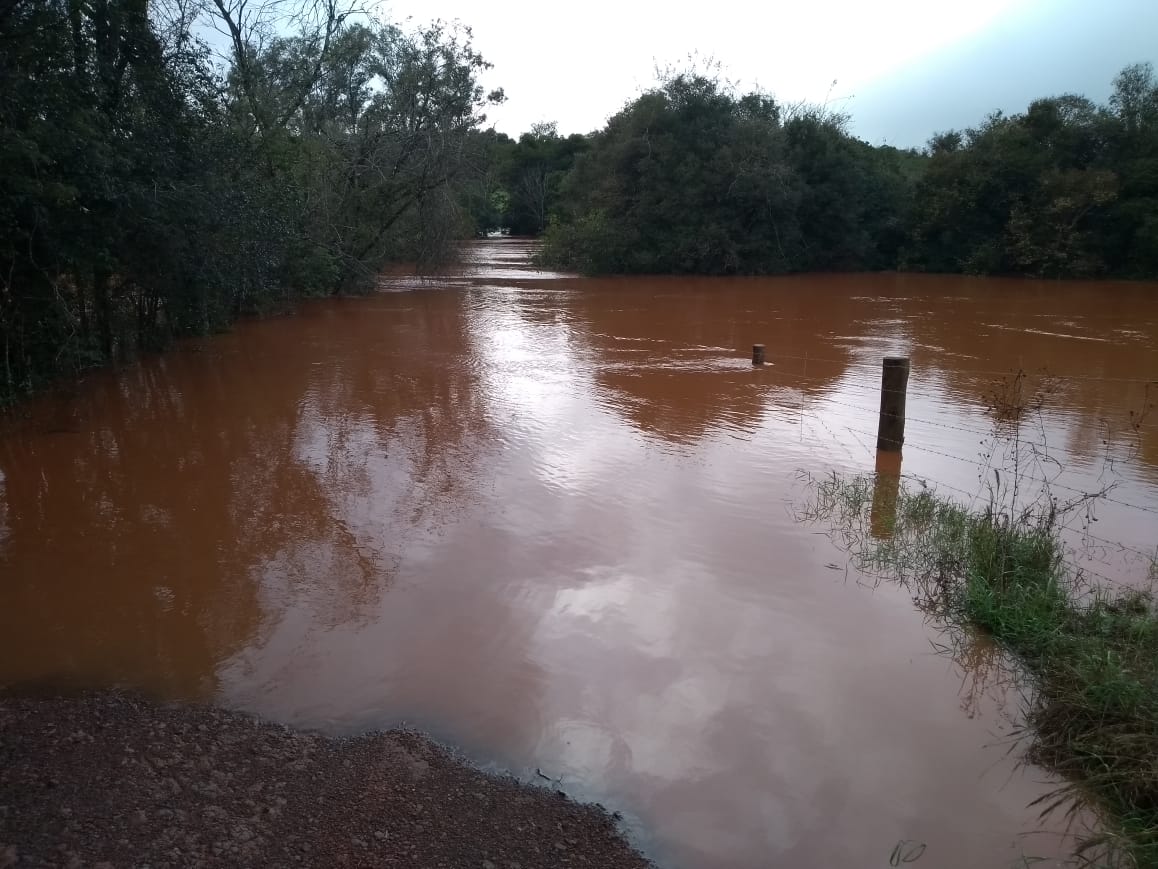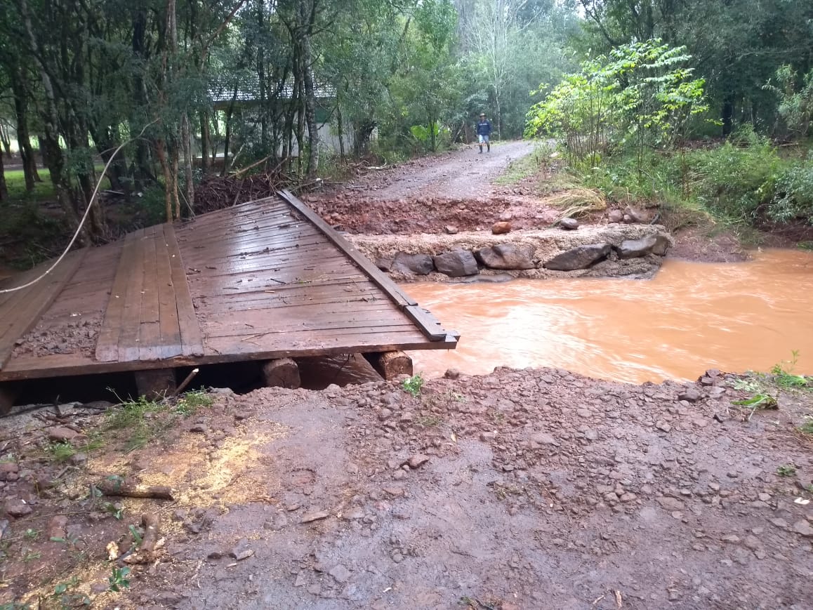 As fortes chuvas que atingiram o município de Santa Rosa deixaram muito trabalho e prejuízos principalmente nas estradas do interior. Desde ontem equipes da Secretaria de Desenvolvimento Rural percorrem o interior do município para fazer um levantamento dos prejuízos causados pelas fortes chuvas. Até o momento, os registros apontam para queda de três pontes: Lajeado Capim, Água Santa e ponte do Rio Santa Rosa na barra do Reginaldo que esta submersa. De acordo com o secretário Valmiro Eisen, para garantir a segurança de todos os locais estão interditados. Informa ainda que as estradas também sofreram danos.