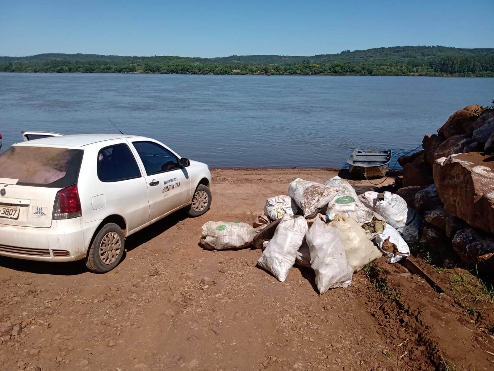 Foram recolhidas em torno de 80 bolsas de embalagens plásticas, garrafas vazias, vidros, isopor, lâmpadas, embalagens de agrotóxicos e outros objetos em 18 quilômetros de margens e leito do Rio Uruguai, fronteiriço à Argentina.