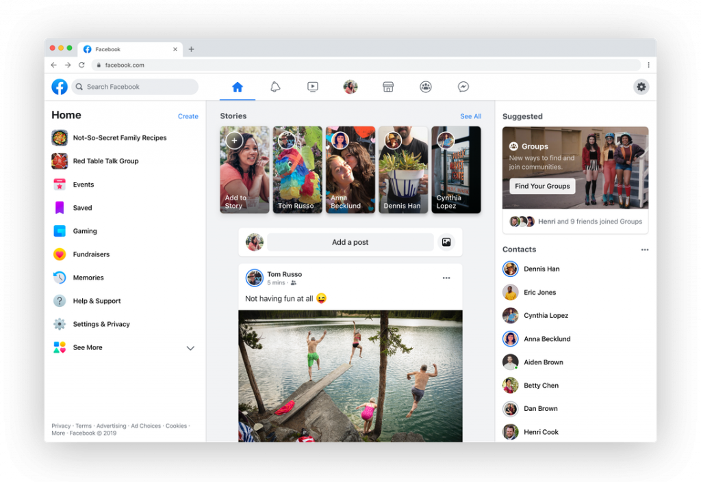 Com o novo visual menos azul e mais branco, o Facebook também vai implementar um modo escuro, similar ao que já existe em tantos serviços e aplicativos, com o objetivo de tornar o uso da plataforma menos desgastante para os olhos. Você pode ver as mudanças na imagem abaixo.