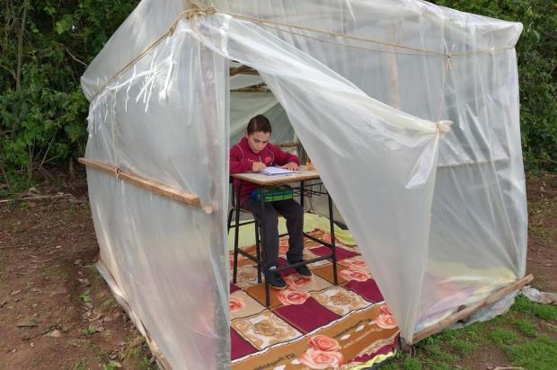 O estudante Alan Somavilla, 11 anos, não precisa mais estudar na barraca construída em meio a lavoura de soja. Três dias após a reportagem mostrar o empenho da família para construir uma estrutura que protegesse o filho das intempéries, o alcance do sinal foi amplificado, não mais restrito apenas a área de plantio, e já atinge a residência do menino.