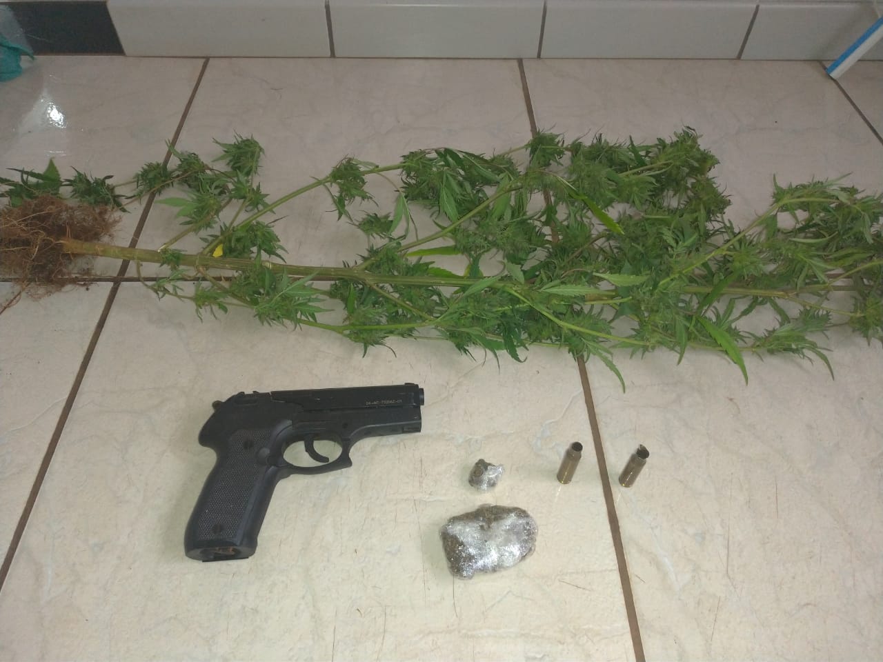 Ao total, foram apreendidas 58 pedras semelhantes a “crack”, um simulacro de arma de fogo, duas plantas semelhantes à maconha, 25 gramas de maconha, aparelhos celulares, além de outros objetos relacionados à traficância.