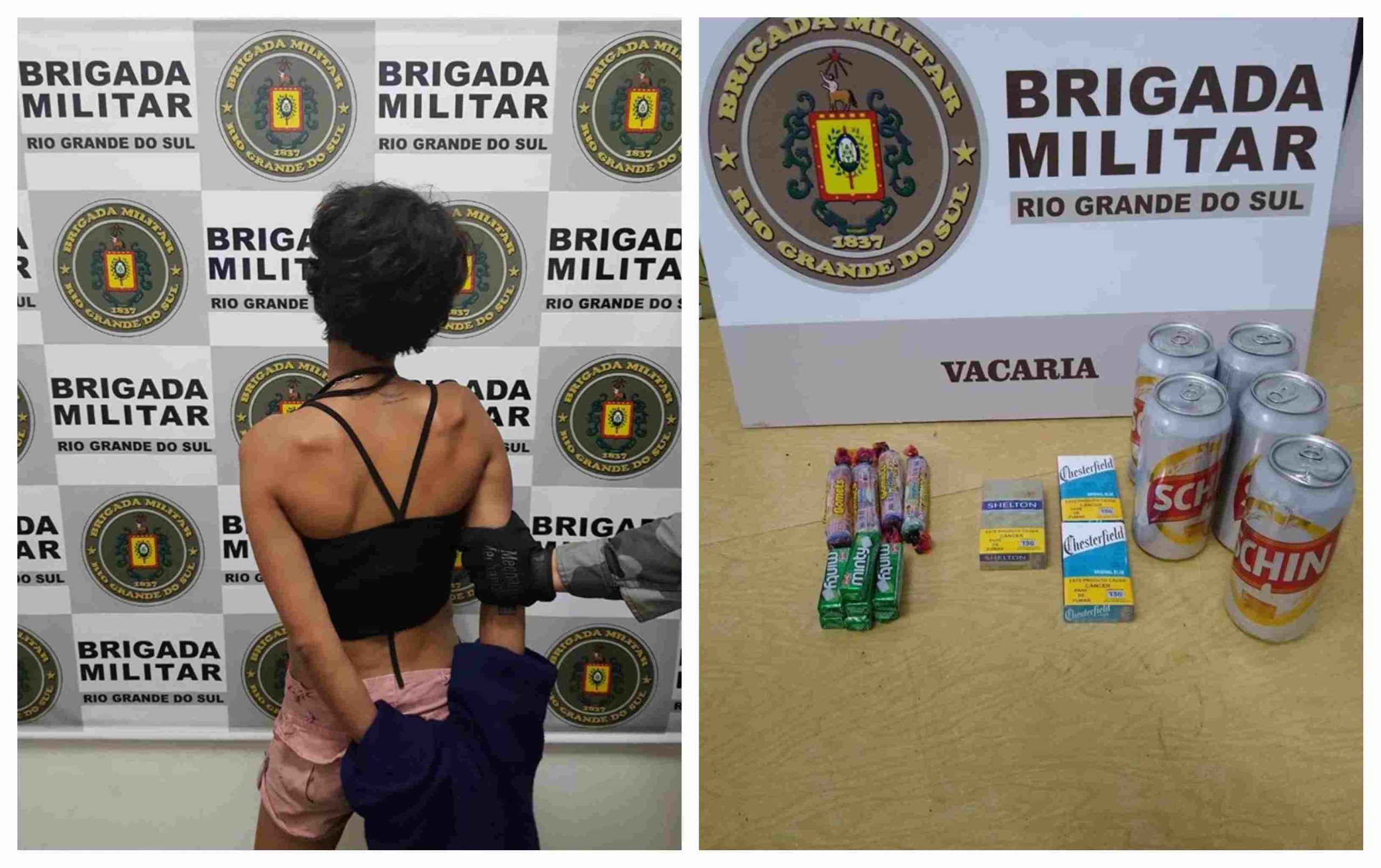 A autora do crime foi detida por policiais da Brigada Militar (BM) próximo ao local do assalto com cinco latas de cerveja, três maços de cigarros, seis pastilhas e quatro gomas. A faca utilizada por ela no roubo foi apreendida.