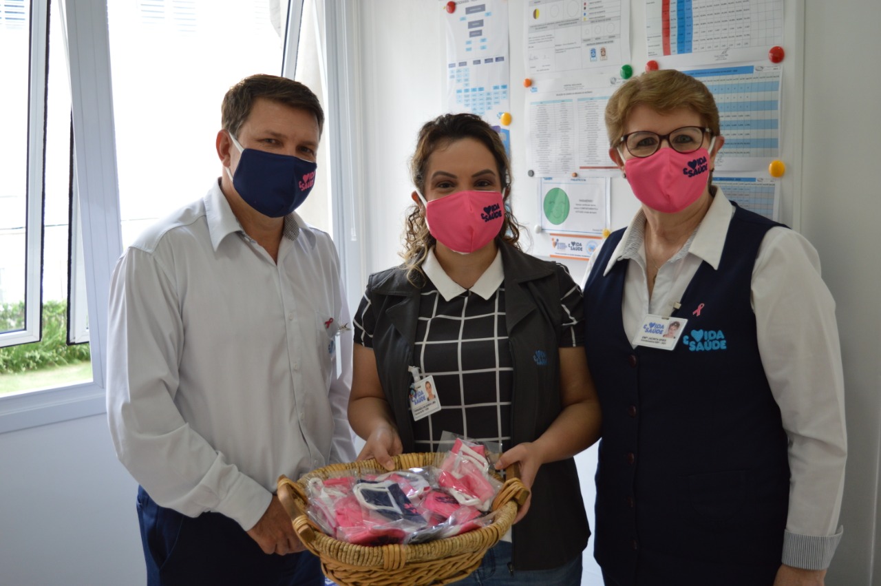 O Outubro Rosa do Hospital Vida & Saúde tem buscado alertar os funcionários sobre a prevenção e conscientização a respeito do câncer de mama. Com atividades limitadas em função da pandemia e sem poder realizar as tradicionais palestras presenciais, o setor de Recursos Humanos do HVS inovou neste ano, confeccionando máscaras de proteção facial na cor rosa.