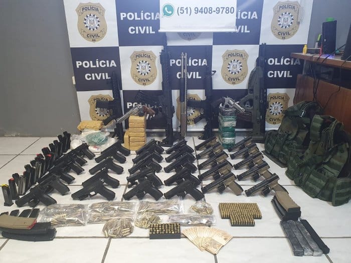 Uma das maiores apreensões de armas já feitas pela Polícia Civil gaúcha ocorreu nesta quinta-feira (24), de acordo com a instituição. Policiais de quatro delegacias do Vale do Sinos encontraram o arsenal durante o cumprimento de mandados de busca e apreensão na residência de integrante de uma facção criminosa no bairro Canudos, em Novo Hamburgo. Além das 38 armas, foram apreendidos drogas, colete balístico, balança de precisão e um carro. Ele foi preso em flagrante e deverá ser indiciado por tráfico de drogas, porte ilegal de arma de fogo e de uso restrito e receptação.