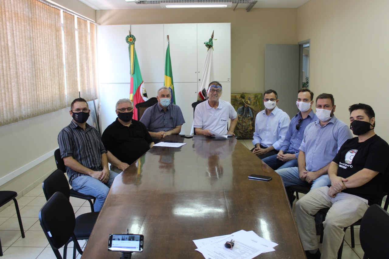Na manhã desta quinta-feira (24) na sala de reuniões do gabinete do prefeito Alcides Vicini e na presença do vice-prefeito Luís Antônio Benvegnú, do prefeito eleito Anderson Mantei, do secretário de Planejamento, Jader Britzke, o presidente da Coopermil, Joel Capelleti, do Engenheiro Civil Henardt Weber Klein, do Chefe de Engenharia, Marcos Bonman e do secretário de Cultura Betto Almeida, aconteceu o ato de assinatura do Alvará de Construção de um Centro de Distribuição da Coopermil, com uma área de 4.160m², localizada na ERS 344, e da Havan. Através de uma vídeo chamada feita pelo prefeito Vicini, Luciano Hang foi informado que o governo municipal liberou o alvará de construção da rede varejista. Com área total de 8.995,50 metros quadrados, a edificação será erguida em ponto estratégico da cidade, na Rua Cruzeiro do Sul, ao lado do Stock Center. O prefeito Alcides Vicini destaca que a instalação da loja da Havan e do Centro de Distribuição da Coopermil mostram claramente o crescimento econômico do município. “São investimentos na construção civil e na geração de empregos que certamente ajudarão nosso município”, analisa.