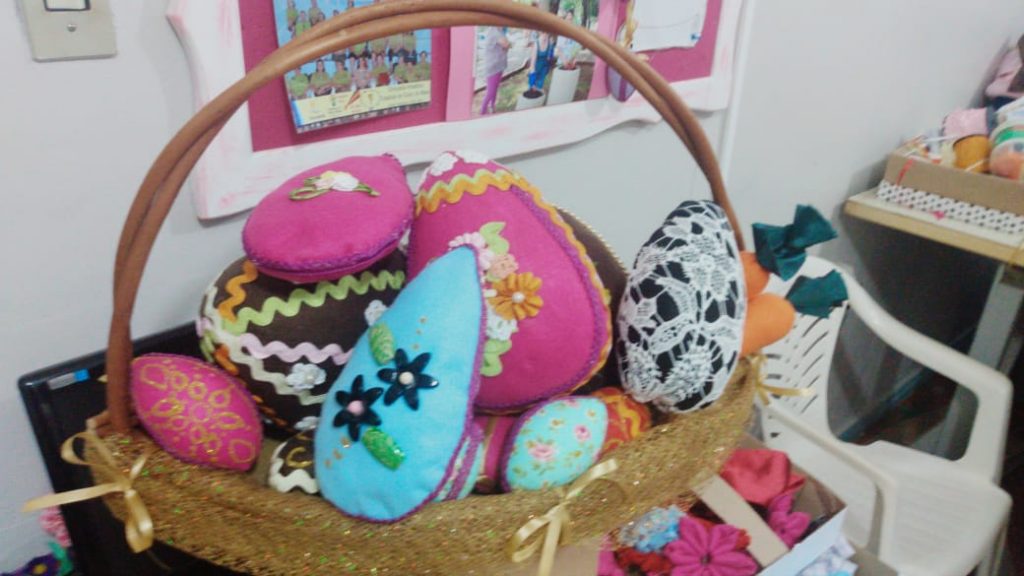 Coelhos, cenouras, flores e ovos de páscoa começam a ganhar vida pelas mãos da equipe do gabinete da Primeira Dama, Economia Solidária e Servidoras Municipais. Numa sala na UCAM, as voluntárias participaram de um curso ministrado pelo SENAR, através do apoio do Sindicato Rural de Santa Rosa, para a produção dos itens decorativos.
