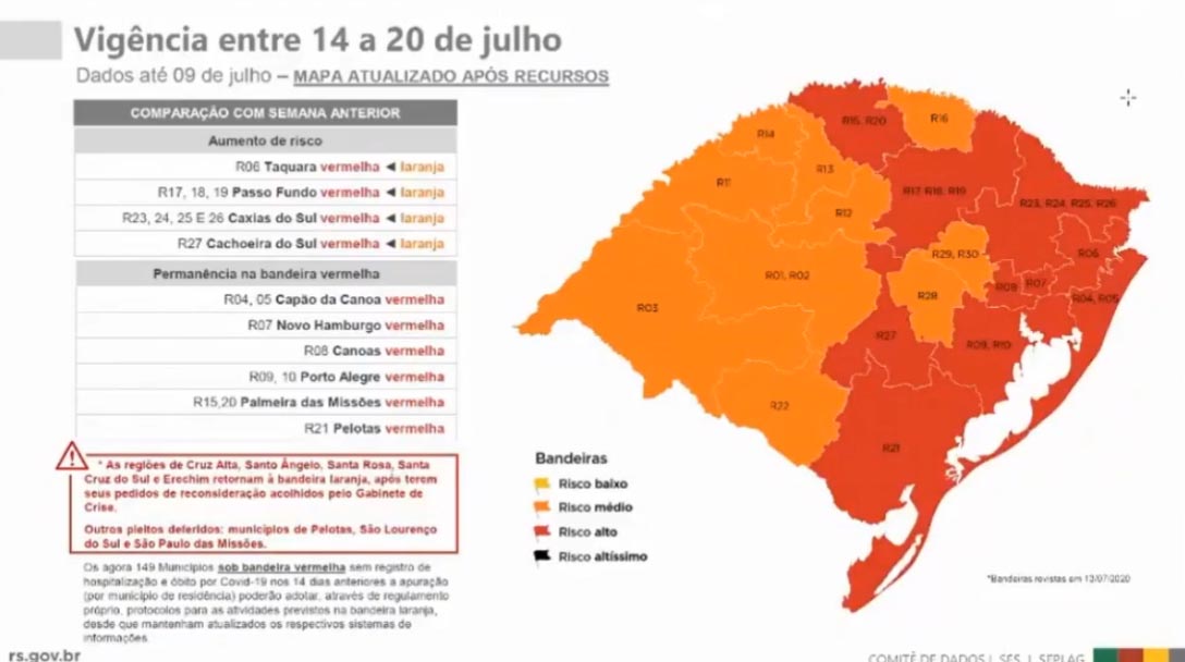 Três dias após colocar 75% do território gaúcho sob bandeira vermelha, o governo do Estado aceitou pedidos de reconsideração e reduziu o status de alerta em cinco das 15 regiões classificadas com risco severo na sexta-feira (10). Dessa forma, ficam sob bandeira laranja Santo Ângelo, Cruz Alta, Santa Rosa, Erechim e Santa Cruz.