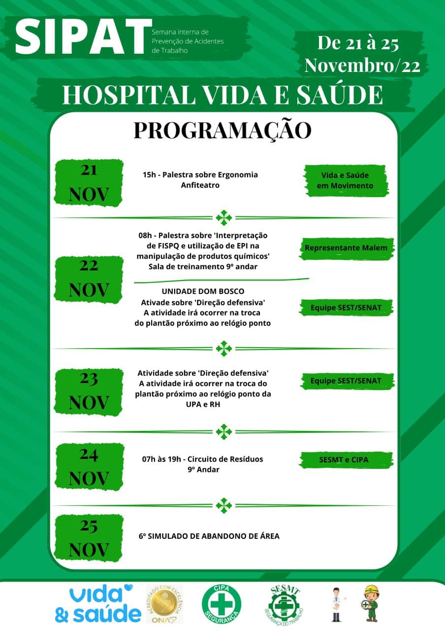 A Comissão Interna de Prevenção de Acidentes do Hospital Vida e Saúde (CIPA) promove na próxima semana, mais uma edição da Semana Interna de Prevenção de Acidentes de Trabalho (SIPAT).