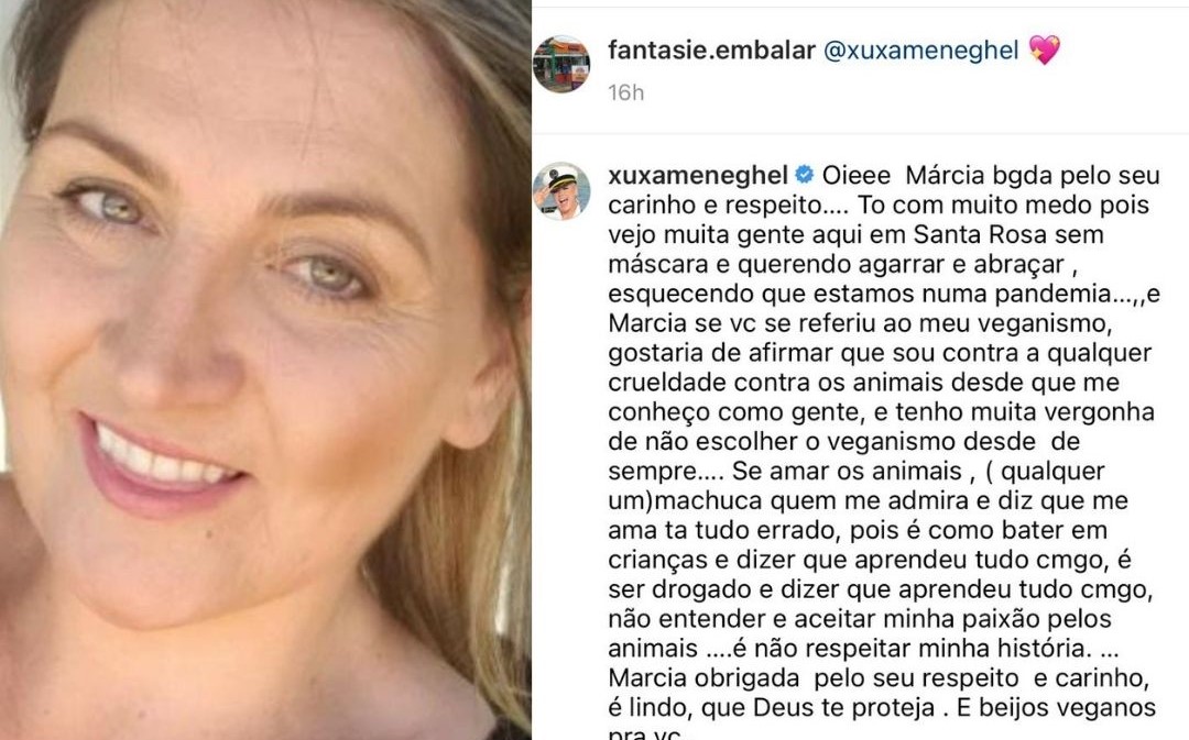 Xuxa respondeu agradecendo pelo carinho e salientou a importância da prevenção, sua preocupação com a pandemia, seu veganismo e a crueldade praticada contra os animais: